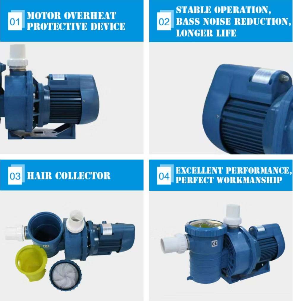 Swimming pool water pump, is suitable for normal swimming pool filtering system, whichcan perform the best function, with high flow and high lift, the heavy duty high performance motor ensures quiet operation, which will not be easily overheated, all the components have the property, ensuring its durable lifespan, and it is the best choice for swimming pool installation.